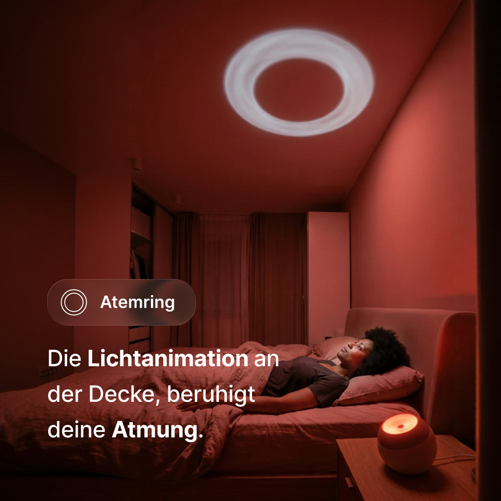 Ich habe bisher vor allem die Meditationen gemacht. Hier hat man die Wahl aus einer weiblichen und einer männlichen Stimme. Ich habe mich für die männliche entscheiden. Die Stimme ist schön warm und man kommt automatisch runter. Die Atemübungen werden von dem Sprecher erklärt und begleitet. Dazu leuchtet der Ring an der Decke. Das ist mein absolutes Highlight an diesem Produkt. Ich merke in kürzester Zeit, wie mich die Atmung „runterfährt“ und meistens schlafe ich ein paar Minuten danach ein.